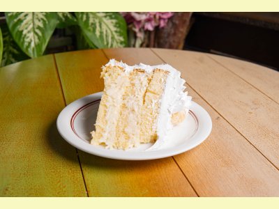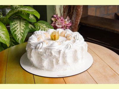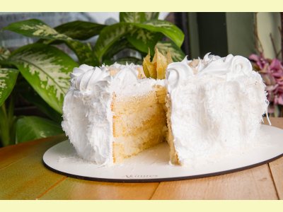 Massa branca, recheio de leite condensado, creme de leite e coco. Cobertura de marshmallow.