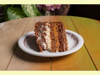 Massa de pão de ló de chocolate, recheio de brigadeiro, prestigio e leite condensado cozido com amendoim. Cobertura de ganache.