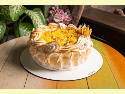 Massa branca, recheio de doce de ovos com coco, estrogonofe de nozes, cobertura de marshmallow caramelizado.