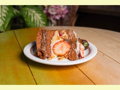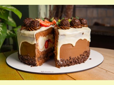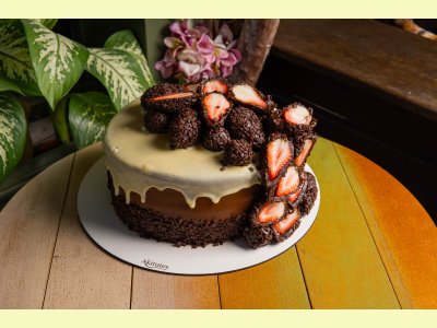 Massa de pão de ló com chocolate, recheio de brigadeiro preto e branco e morangos inteiros. Cobertura de chocolate e morangos selecionados.