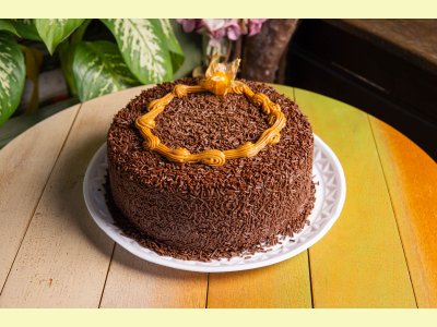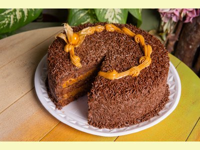 Massa pão de ló de chocolate e recheio de leite condensado cozido. Cobertura de brigadeiro mole com granulado.
