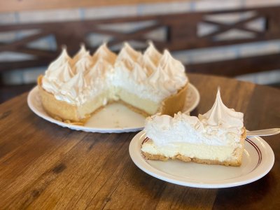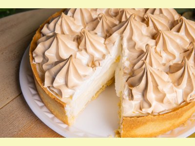 Casquinha de bolacha assada, recheio de mousse de limão cítrico e cobertura de marshmallow cozido.