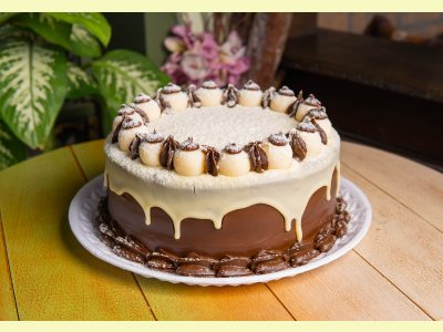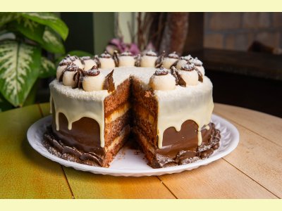 Massa de pão de ló de chocolate e recheio de brigadeiro branco de Leite Ninho e Nutella.