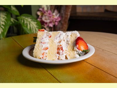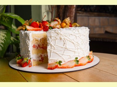 Massa branca, recheio de chantilly, morangos picados e suspiro. Cobertura de chantilly e morango.