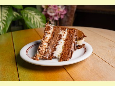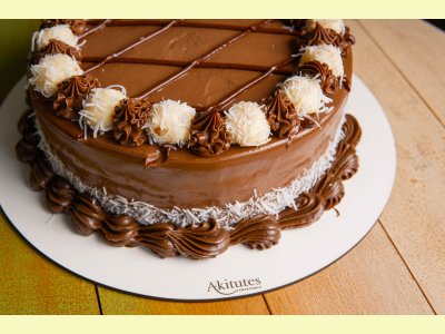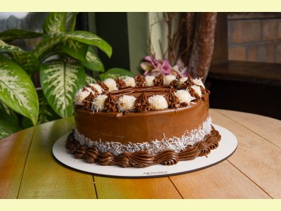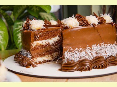 Massa de pão de ló de chocolate, recheio de coco com leite de coco e ganache. Cobertura de chocolate com docinhos de coco.