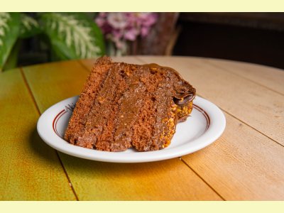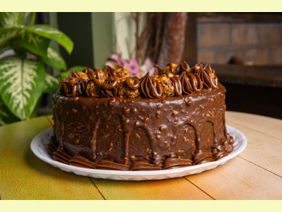 Massa pão de ló de chocolate, recheio de Nutella, chocolate meio amargo e avelã.