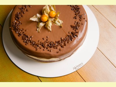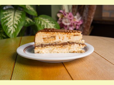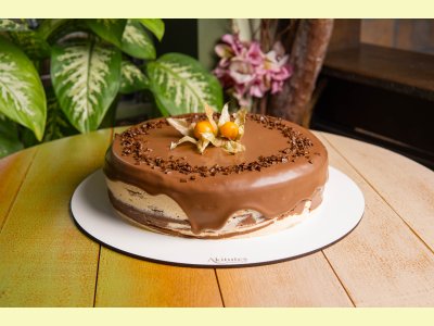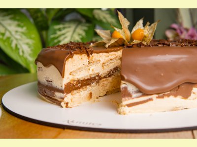 Biscoito tipo Maria, creme de gemas, creme de leite e manteiga. Uma camada de ganache e cobertura de chocolate.